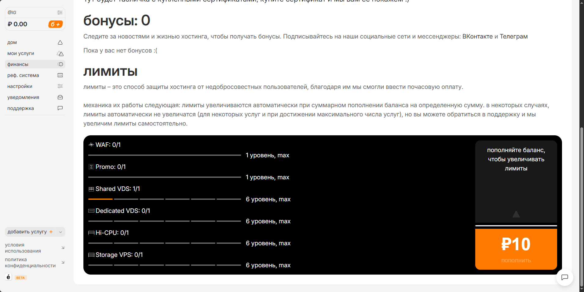Перейдя в этот раздел, вы сможете изучить ограничения каждого вида предоставляемых услуг и требования, которые позволят вам превысить текущие значения.