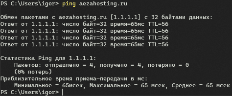 Далее пропишем команду «ping» и адрес нашего сайта и нажмём Enter:
