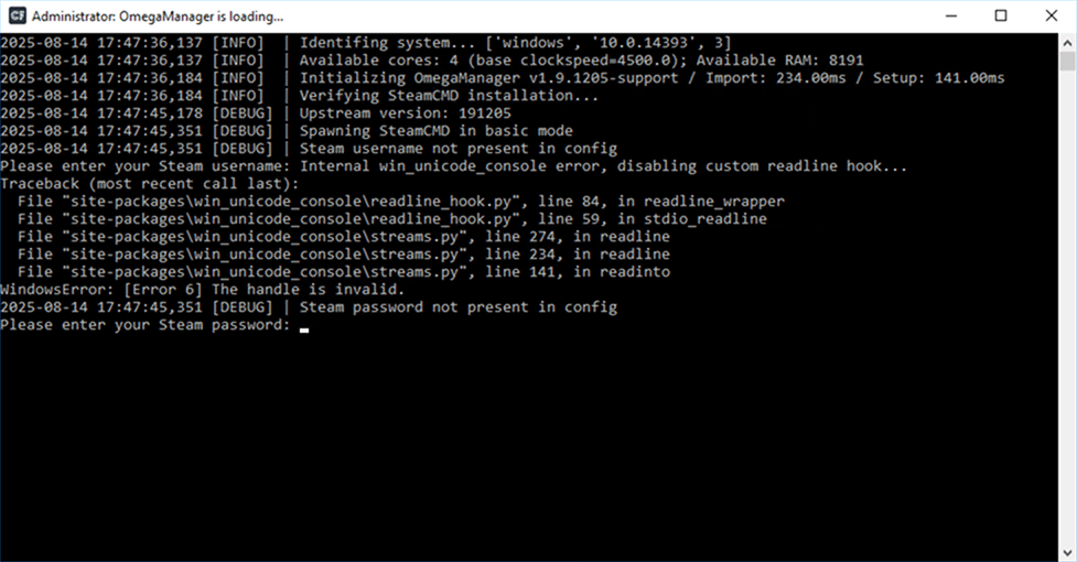 Не закрывайте командную строку OmegaManager, это приведёт к недоступности веб-панели и выходу из аккаунта Steam в ней. Она должна быть открыта на постоянной основе.