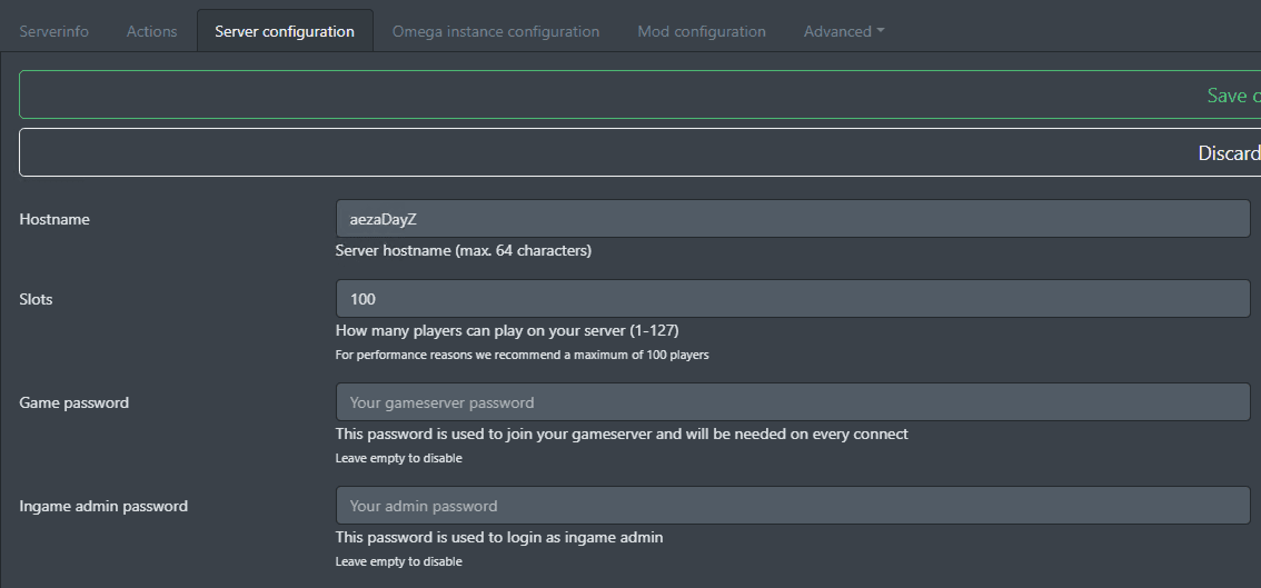 В OmegaManager пройдём по пути Dashboard → Overview → Server configuration и изменим:
