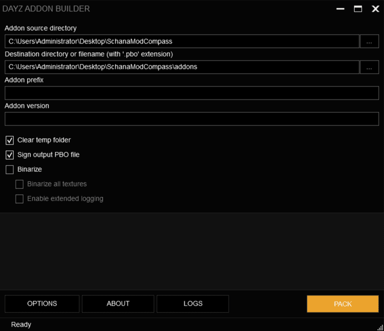 Destination directory or filename (with .'pbo' extension)также добавим расположение папки с модом, но уже с папкойaddons