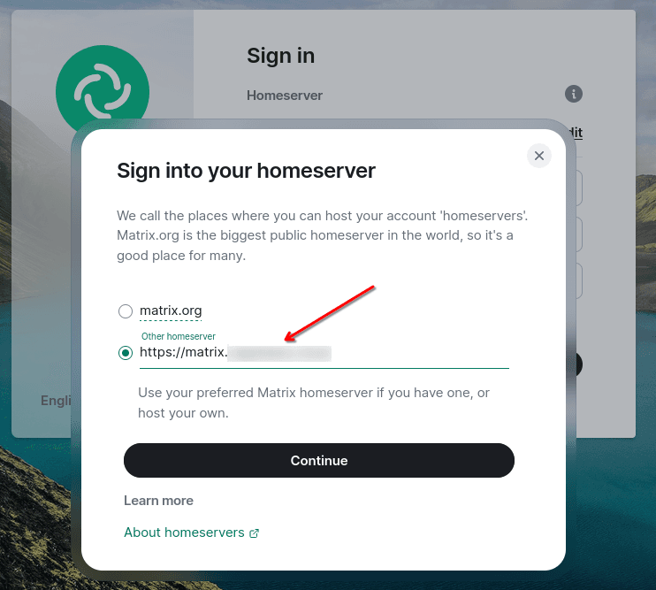 После чего вписываем адрес вашего домена, который вы использовали для развертывания собственного сервера Conduwuit и подтверждаем кнопкой "Continue":