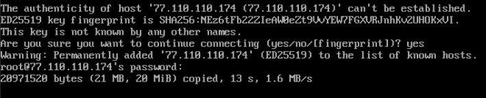 dd if=/dev/vda bs=10M conv=fsync status=progress | gzip -c -9 | ssh root@NEW_SERVER_IP 'gzip -d | dd of=/dev/vda bs=10M'С помощью стрелок и Del/Backspace редактируем команду. В данном случае символы “@” и “|” вставились как “2” и “\”, необходимо их заменить на корректные.