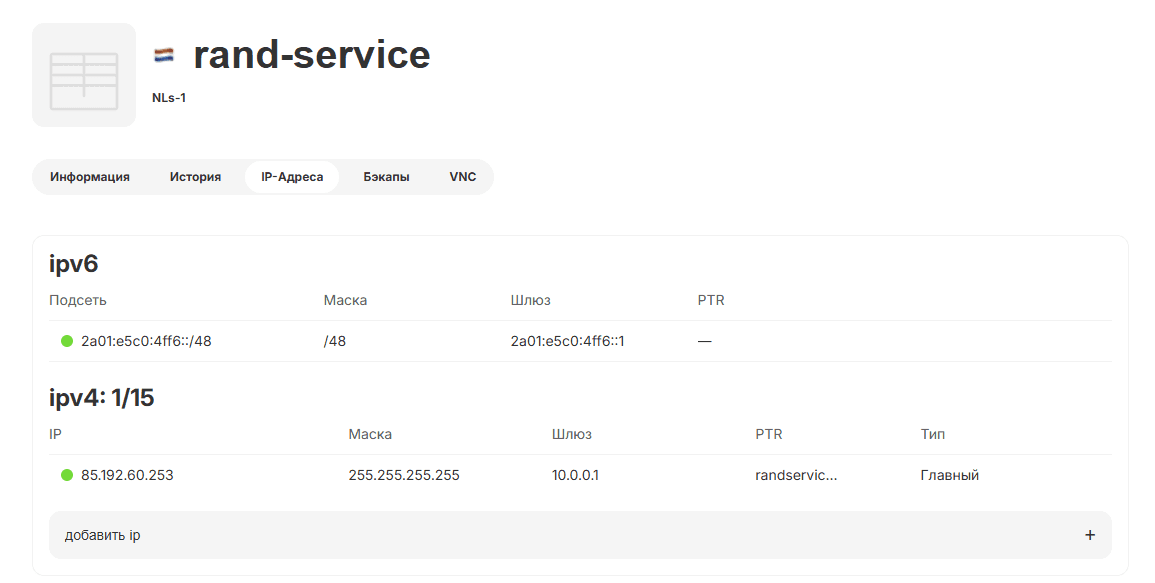 После того, как был изменен пароль суперпользователя, мы можем начать конфигурацию сети. Все требуемые сетевые параметры (IP-адрес, шлюз и маска) указаны в личном кабинете на странице услуги (в подразделе "IP-Адреса"):