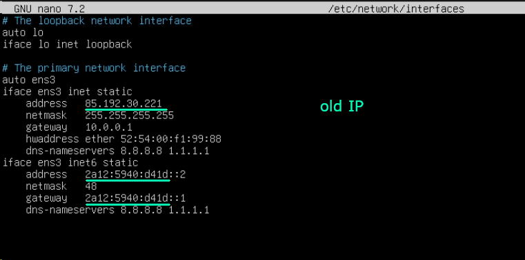 Заменяем IPv6 адрес и IPv6 gateway на новый (стандартный адрес оканчивается на ::2, любой ipv6 шлюз оканчивается на ::1, нужно заменить только номер подсети).