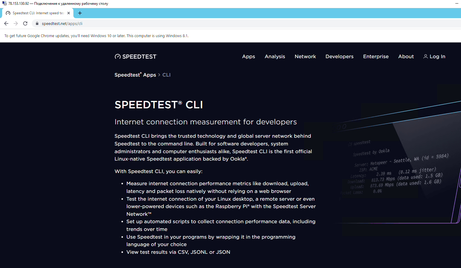 Заходим в любой браузер на сервере и переходим по ссылке: speedtest.net