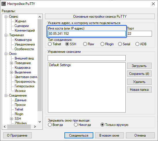 Открываем программу для подключения к серверу PuTTY и укажем IP-адрес нашего сервера.