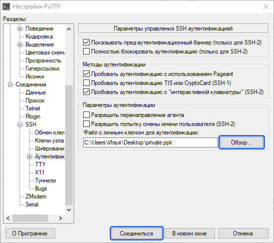 Указываем расположение нашего приватного ключа, имеющего расширение .ppk. Нажимаем кнопку «Соединиться».