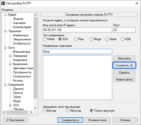 Для экономии времени, вы можете сохранить в PuTTY свои данные для подключения.
