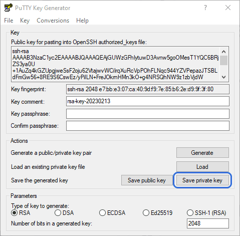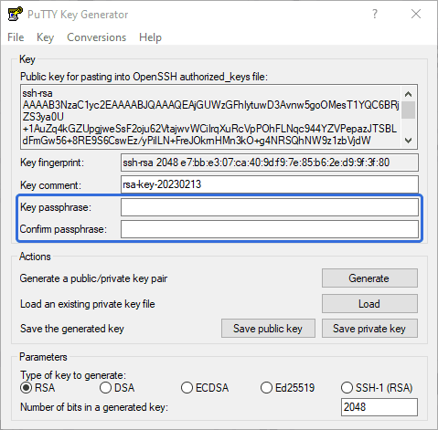 Для большей безопасности вы можете дважды указать второй «приватный» пароль, введя его в строке «Key passphrase». Он будет требоваться при каждом подключении к серверу. Сохраним его так же в удобное место.