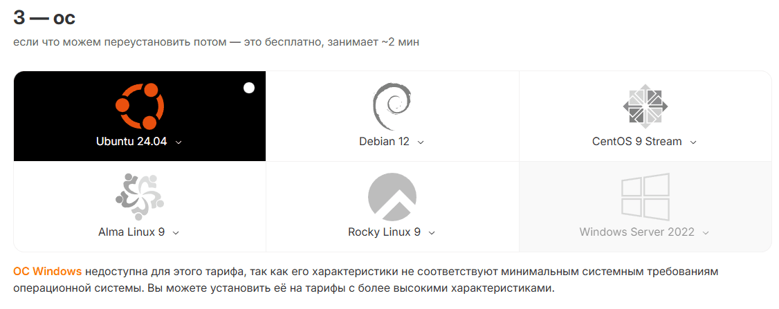 Выбираем операционную систему Ubuntu последней версии - 24.04.