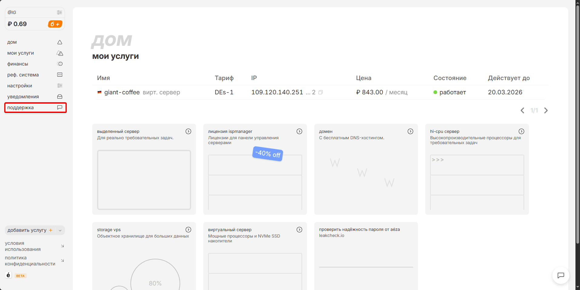 Зайдём в личный кабинет Aéza и нажмём кнопку «Поддержка» в левом нижнем углу.