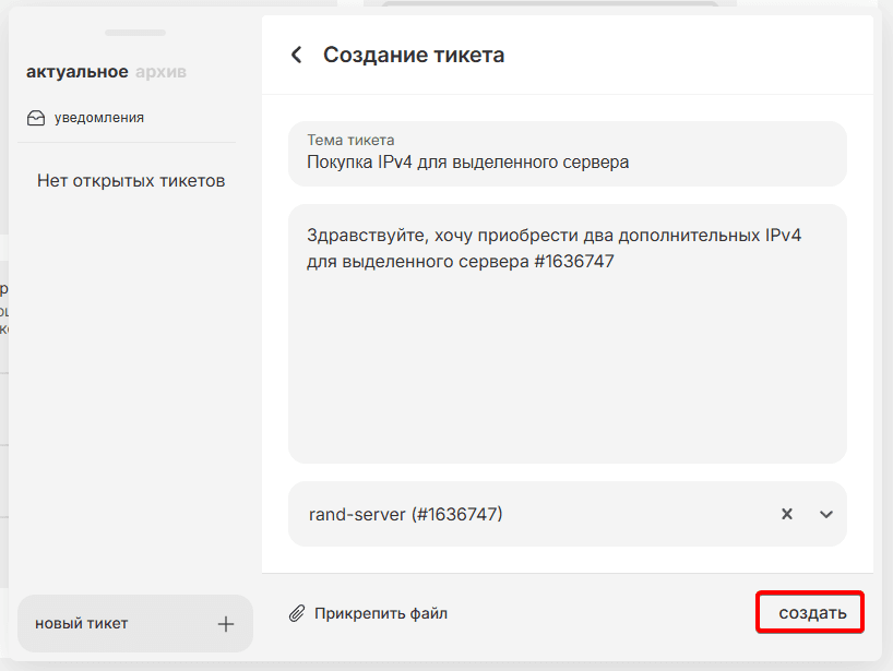 Укажем в теме обращения «Покупка IPv4 для выделенного сервера» В обращении желательно указать количество дополнительных IP-адресов и ссылку или название выделенного сервера, для которого требуются новые IP-адреса. Создаём новый тикет.